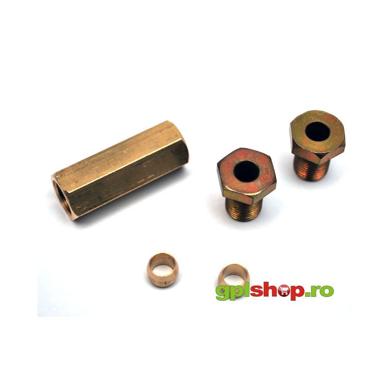 Element pentru imbinarea a 2 conducte de cupru, una de 8mm cu una de 10mm. Piesa contine si biconurile pentru etansare. Filete M12/M14